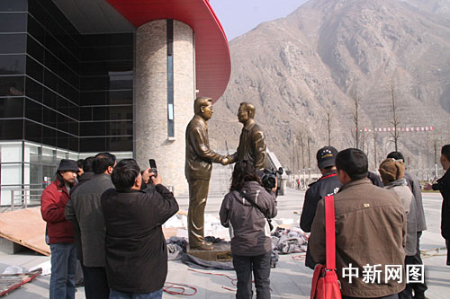 中新網汶川1月29日電(薛升玉 張瑤)1月29日上午,汶川縣體育館前鑼鼓陣陣,“咔嚓”的快門聲不斷,一尊高2.98米、寬1.68米、厚0.94米的“胡主席和溫總理在災區(qū)”大型雕塑吸引了許多過往群眾駐足留影。這尊由陜西省大荔縣宣傳部捐贈的大型雕塑,將收藏到汶川縣禹羌博物館。