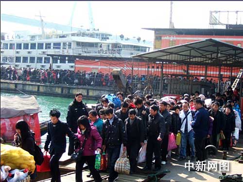 2月20日,一連寂靜數日的宜昌港口迎來節后首次農民工出行高峰,19艘客船共10156人直接通過三峽、葛洲壩兩個船閘下行抵達了宜昌港。據宜昌港負責人介紹,當天共有37艘普通客船、18艘高速客船出川,創下今年春運以來日出川客流量最高峰。除19艘客船直接抵達了宜昌港外,還有36艘客船未過三峽船閘,直接駛入了三峽壩首的太平溪港和茅坪港,出川農民工下船后再乘轉運客車通過三峽專用公路抵達宜昌分流。