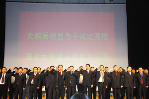 在武隆縣委常委楊國權(quán)、吳成武、李成群等上臺(tái)之后,其他縣領(lǐng)導(dǎo)、部門領(lǐng)導(dǎo)也相繼走上前臺(tái),舉起右拳立下誓言。因?yàn)檫^于緊張,平常舉止大方的“一把手”們還鬧出不少笑話。有的變得結(jié)巴,有的忘了事先想好的誓詞,有的忘了舉起右手,還有人忘了報(bào)自己姓名。但不管過程如何,所有宣誓人最后一句話都離不開“如果完不成任務(wù),我主動(dòng)辭職”。