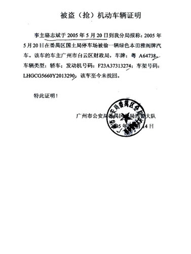 該博文還附了幾張文件的掃描圖作為證明。一張成交日期剛好是2005年5月20日的由番禺區國土房管局開出的《契稅完稅證》,納稅人為“駱×”,房地產位置為錦繡香江花園××園×街×號;一張六天后廣州市國土房管局開出的同處房產的《房地產權情況證明》,權屬人為“駱×”,但備注注明共有人為韓××及駱志斌;一張廣州市公安局番禺分局刑警大隊開出的《被盜(搶)機動車輛證明》(見左圖),上寫駱志斌于2005年5月20日到該分局報案稱,本田雅閣汽車當天在番禺區國土局停車場被盜。網友注明,“駱×”為駱志斌的公子。另外,網友還附了一張房產圖片,稱錦繡香江花園同樣位置的別墅在2006年已賣到每平方米3萬元。