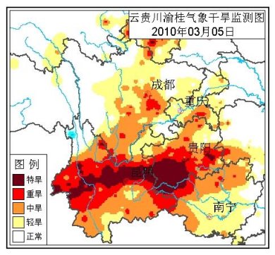 中新網3月5日電 中央氣象臺3月5日18時繼續發布干旱黃色預警:根據3月5日監測,云南大部、貴州大部、四川南部和廣西西北部等地維持氣象干旱重旱等級。預計,未來三天,除云南西北部和東北部、貴州大部有小到中雨(雪)外,其它旱區基本無降水。云南大部、貴州西部、四川南部、廣西西部氣象干旱將持續發展。