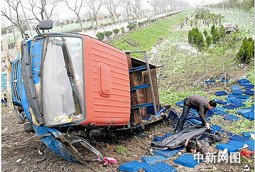 在事發現場,變型拖拉機已被吊車懸在田埂邊,死者趴在車旁的泥土中,周圍散落著上百只塑料筐及齒輪。距離變型拖拉機約10米遠的農田里,停著一輛黑色鎮江牌照的轎車,車身有毀損。幾名交警正忙著勘查現場,指揮交通。