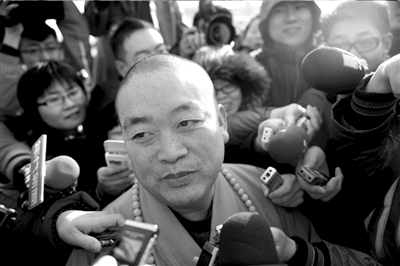 每次人大代表“走紅地毯”時(shí),圓臉方耳、身穿黃色袈裟、足蹬黑色布鞋的全國(guó)人大代表、少林寺方丈釋永信一出現(xiàn)在廣場(chǎng)上就會(huì)被記者團(tuán)團(tuán)包圍,“方丈,聽說你開越野車”“方丈,你現(xiàn)在是住在大別墅了吧?”……面對(duì)大家拋出的各種問題,他不急不惱,邊低聲念“阿彌陀佛”邊試圖向密不透風(fēng)的人墻外移動(dòng)。見叱咤少林寺的大師卻被眾人圍堵得步履維艱,好事者喊了句“大師,用輕功啊”!大師就是大師,面對(duì)記者們刁鉆的問題,他往往用微笑代替回答,“我知道,就算我不說話,也會(huì)成為新聞”。