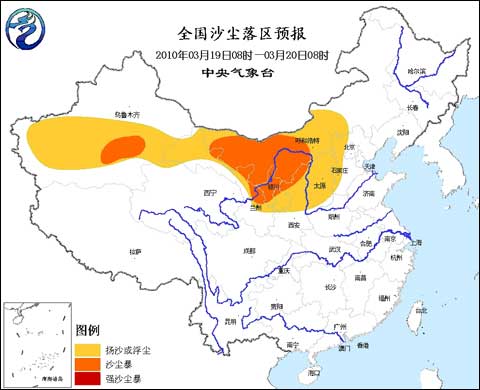 受蒙古氣旋和冷空氣影響,19日08時至20日08時,南疆盆地、甘肅中西部、內蒙古中西部、寧夏、陜西中北部、華北中西部等地有沙塵天氣,其中,南疆盆地東部、甘肅中西部偏北地區、內蒙古西部、寧夏北部、陜西西北部等地的部分地區有沙塵暴,上述地區并有5~6級偏北風,陣風風力可達7~8級。