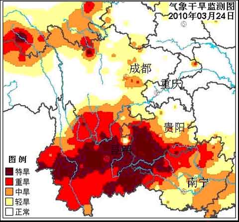 另據3月24日農業干旱綜合監測表明,云南大部、貴州中南部、四川南部、廣西西部仍存在中度以上農業干旱,其中云南中部、貴州西南部、廣西西北部為重旱。