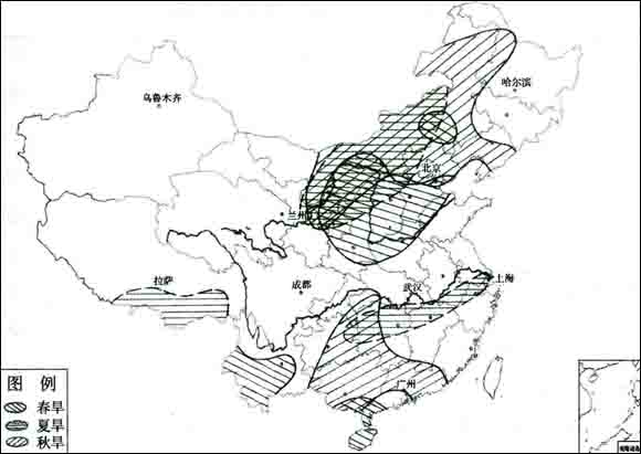 2005年我國(guó)降水總量較常年稍偏多,其中西北西部、青藏高原北部、黃淮南部偏多3成至1倍,南疆部分地區(qū)偏多1倍以上,而寧夏、內(nèi)蒙古、北京、貴州等部分地區(qū)偏少1~3成,全國(guó)其余地區(qū)降水量則接近常年。年內(nèi),降水分布比較均勻,沒(méi)有出現(xiàn)大范圍、持續(xù)時(shí)間長(zhǎng)的嚴(yán)重干旱,旱情較常年輕;但華南南部出現(xiàn)嚴(yán)重的秋冬春連旱,云南發(fā)生近50年來(lái)少見(jiàn)的嚴(yán)重春旱,西北東部以及內(nèi)蒙古等地發(fā)生夏秋連旱,江南西部、華南一度秋旱明顯。全年受旱面積較大或旱情較重的有內(nèi)蒙古、寧夏、山西、陜西、廣東、廣西、海南等省(區(qū))。2005年旱區(qū)分布如圖所示。總體看來(lái),全國(guó)嚴(yán)重持續(xù)性干旱范圍較小,損失偏輕,受災(zāi)面積遠(yuǎn)低于20世紀(jì)90年代以來(lái)平均水平。