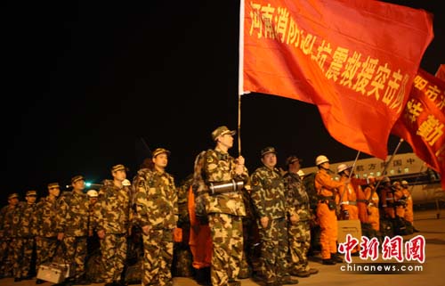 中新網4月15日電(王登峰 王志軍)今日凌晨3時,按照公安部命令,河南省消防總隊跨區域應急救援隊在總隊長夏夕嵐帶領下,從鄭州市新鄭機場乘飛機趕赴青海玉樹縣災區抗震救災。