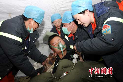 “‘帳篷醫院’在哪,快,快,快救救我們的戰士!”20點10分,一陣嘈雜聲由遠至近,一群官兵抬著一位身著米彩服的戰士疾速奔向武警總醫院“帳篷醫院”。很快,一場緊張的急救隨即展開。小伙子叫黃鄆,蘭州軍區某通信總站二營九連戰士。19:50分左右,小黃在抬運抗震救災柴油時,突發急性肺水腫,昏迷不醒,意識不清,呼之不應,雙眼上翻,眼看就可能發生生命危險。被戰友發現后,迅速送到武警總醫院“帳篷醫院”。經過醫護人員的精心救治,18分鐘后,小黃意識逐漸清醒,生命體征恢復平穩,脫離了生命危險,奇跡般地醒了過來,隨后被轉送西寧進行救治。