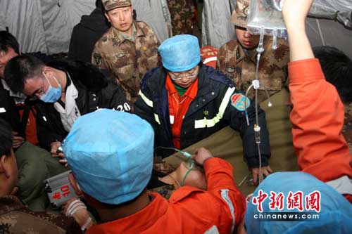 中新網玉樹4月18日電(姚洪華)“快,快,速尿、氫考、氨茶堿……”4月18日20點10分,武警總醫院“帳篷醫院”內燈火通明,醫療隊隊長侯世科帶領醫護人員正在進行一場緊急的搶救。站在一旁的蘭州軍區某通訊站政委緊張地不斷用手擦試額上的汗珠。18分鐘后,患者眼開了雙眼,恢復了意識,并在第一時間認出了在身邊一直為自己擔心的政委和戰友們。這時,大家懸著的心終于落了下來。