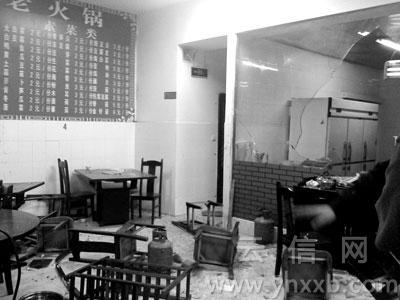 “砸!”一聲“令”下,幾十人拿著砍刀和鋼管,在火鍋店就開(kāi)始到處亂砍。“噼里啪啦”火鍋店的玻璃窗粉碎性掉落,啤酒瓶、餐具接二連三被砸碎,正在沸騰的火鍋被掀翻在地,墻上、地上灑滿紅油。頓時(shí)店里一片混亂,客人、服務(wù)員紛紛沖進(jìn)廚房躲避。