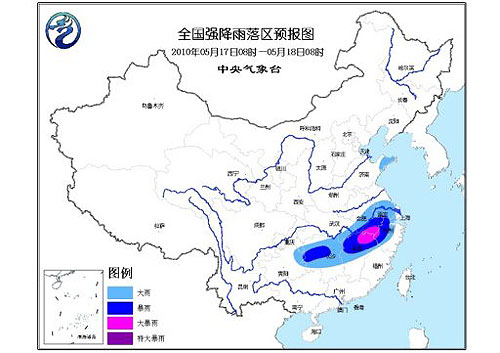 中新網5月17日電 中央氣象臺17日06時繼續發布暴雨藍色預警:預計,17日08時到18日08時,湖北東部、安徽中南部、江蘇中南部、浙江中西部、江西中北部、湖南中北部、貴州東北部及山東半島等地有大到暴雨。