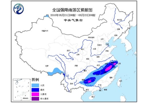 中新網5月21日電 中央氣象臺21日06時繼續發布暴雨藍色預警:預計,21日08時到22日08時,湖北東南部、安徽南部、江蘇南部、上海、浙江中北部、江西中北部、湖南、貴州東部和南部、廣西中北部以及云南西北部等地有大到暴雨,局部地區有大暴雨。