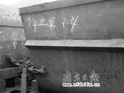 記者昨日在現場看到,礦井出口處擺著9名死難礦工的遺體,遺體旁是一排車斗,一個車斗上還有工頭用白色粉筆記錄下的死者李業軍5月26號的產量———早班4斗。