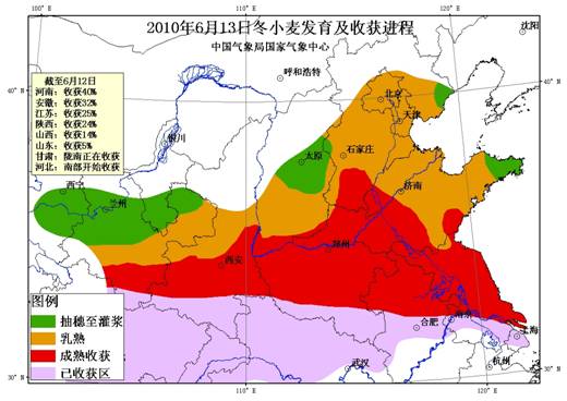 據農業部統計,截至6月12日全國已收獲冬小麥1.11億畝,麥收進度32%。其中,河南已收40%,安徽已收32%,江蘇已收25%,陜西已收24%,山西已收14%,山東已收5%。江蘇油菜收獲進入尾聲。