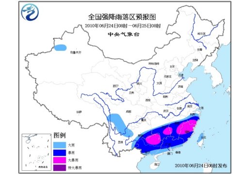 中新網6月24日電 中央氣象臺6月24日06時繼續發布暴雨黃色預警:預計,6月24日08時到6月25日08時,貴州南部、湖南中南部、江西大部、浙江中南部、福建、廣東大部、廣西等地有大到暴雨;廣西東北部、湖南東南部、江西中部偏東和中部偏西、浙江南部、福建中北部等地的部分地區有大暴雨;上述部分地區并伴有短時雷雨大風等強對流天氣。