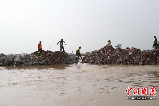 下午4點左右,數米長的小口子,已經被接連倒下的七八卡車石料填成數十厘米寬的“裂縫”,由于大壩堤外水位比撫河水位高,洪水從堤外往河內倒流,剩下的最后“裂痕”就像一條涓涓細流,不少人在上面來回走動,幾天來難以跨越的決口,終于連在了一起。