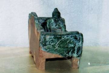 1、床:該床尺寸:長(zhǎng)20.5cm,高:14cm,寬:12cm。從造型看漢代床的特征極為明顯。該床由三部分組成:床板,邊框,支架。該床為厚板與邊框護(hù)板相連。床面上刻有幾何形方格紋,又稱錢眼紋,泉源紋,即,古銅錢中心方孔紋飾。寓意睡臥錢眼,后輩有錢。床上邊框?yàn)樽蟆⒑蟆⒂胰娓咦o(hù)板組成。后護(hù)板中高、兩低。每塊護(hù)板上模印草花。寓意草繁茂盛。床板與邊框護(hù)板相連放在四腿支架上。四腿支架前后又有護(hù)板。前護(hù)板上三個(gè)方格內(nèi)有卷草模印圖案,后護(hù)板無(wú)釉無(wú)紋為黃泥土胎。