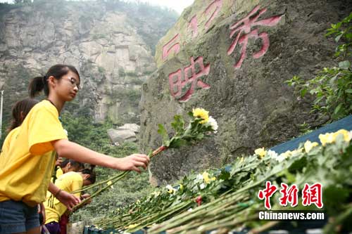 中新網成都7月31日電 (徐楊祎 張浪)31日,來自歐美大陸的170多位海外華裔青少年,前往“5·12汶川地震”震中映秀鎮,參觀地震遺址,寄托哀思。在地震飛來石祭臺,同學們自發購買鮮花,深切哀悼在地震中不幸遇難的同胞們。