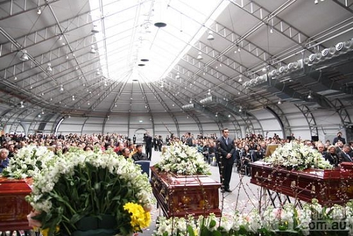追思會的最后階段,所有親友和來賓陸續(xù)上前,向遺體告別并進(jìn)獻(xiàn)獻(xiàn)花,會場內(nèi)響起了歌曲《回家》。下午一點,眾人目送靈柩離場。五具靈柩被運送前往麥夸里墓園。