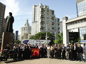 中新網9月27日電 據美國《僑報》報道,來自紐約大學Poly學院中國學生學者聯(lián)誼會、中美青年聯(lián)合會的一群80后青年學子,25日在紐約華埠且林士果廣場和僑胞們一起舉行了慶祝祖國60周年華誕和紀念中美兩國建交30周年中、美兩國國旗傳遞和升旗儀式。