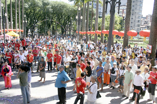 6日上午,圣保羅市中心SE 廣場四周懸掛數十個巨型大紅燈籠,古老的大教堂前臨時搭起了舞臺,臺上貼有中國春聯掛有中國結等節日吉祥物,組合音響播放著喜慶的中國民樂,廣場一側設有中國文化藝術攤位,廣場上一派節日的歡快喜慶景象。