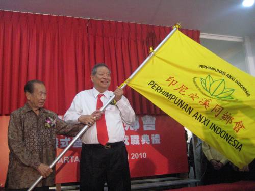 總主席白德明從資深榮譽主席唐裕手中接過會旗后表示,印尼安溪鄉親這些多年來夢寐以求的同鄉會,終于正式成立,舉行首屆的理監事就職典禮。
