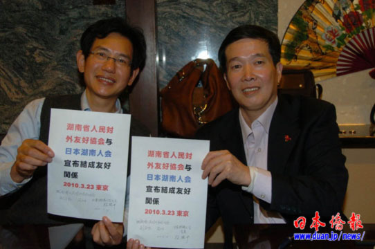 龐力平副會長及訪日團一行高度評價日本湖南人會的活動搞得好,為推動湖南與日本的交流做出了貢獻,勉勵該會繼續努力,爭取更大的成績向家鄉人民匯報。在龐力平副會長的提議下,日本湖南人會與湖南省人民對外友好協會當場簽署了結為友好關系的文件。