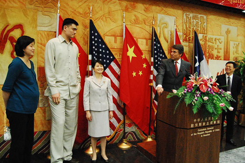 中新網(wǎng)4月28日電 據(jù)美國《美中信使報(bào)》報(bào)道,中國駐休斯頓總領(lǐng)事高燕平與美國德克薩斯州州長里克.佩里于當(dāng)?shù)貢r(shí)間27日下午5時(shí)在總領(lǐng)館會(huì)議大廳舉辦“慶祝上海世博會(huì)和中國-得州友好關(guān)系”招待會(huì)。擔(dān)任上海世博會(huì)形象大使的中國著名籃球明星姚明和他的妻子葉莉以及當(dāng)?shù)厝A人僑領(lǐng)及學(xué)界代表200余人應(yīng)邀出席招待會(huì)。