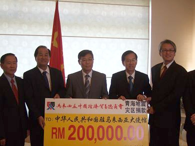 中新網5月6日電 據中國外交部網站消息,近日,馬來西亞馬中經貿總商會、馬華公會公共服務及投訴局以及華商Yap Kim San 先生前來中國駐馬來西亞使館,轉交向青海玉樹地震災區捐款。