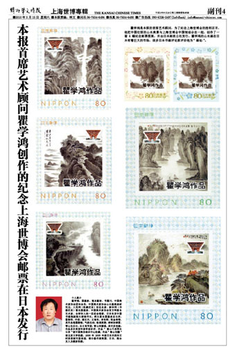 中新網(wǎng)5月18日電 據(jù)日本《關(guān)西華文時(shí)報(bào)》報(bào)道,5月15日,該報(bào)首席藝術(shù)顧問曲學(xué)鴻創(chuàng)作的紀(jì)念上海世博會(huì)郵票在日本發(fā)行。為了紀(jì)念上海世博會(huì)的勝利召開,他把中國(guó)壯麗的山水美景與上海世博會(huì)中國(guó)館結(jié)合在一起進(jìn)行繪畫創(chuàng)作,創(chuàng)作了一套6幅紀(jì)念郵票圖案,并由日本郵便株式會(huì)社發(fā)行。