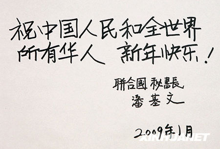 在中國(guó)傳統(tǒng)春節(jié)佳節(jié)到來(lái)之際,多國(guó)政要紛紛發(fā)表賀詞賀信,向華人和中國(guó)人民拜年,祝賀新春。在這其中最為引人注目的是,1月23日,聯(lián)合國(guó)秘書(shū)長(zhǎng)潘基文特意用漢字寫(xiě)下了對(duì)中國(guó)人民和全球華人的新春祝福:“祝中國(guó)人民和全世界所有華人新年快樂(lè)!”