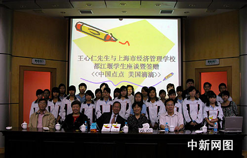 今天的贈書儀式上,王心仁先生與大家分享了他的人生經驗。當了解到去年汶川大地震后上海市經濟管理學校接收了近70名來自上海對口支援地區四川都江堰的學生時,王心仁先生勉勵這些遠離家鄉的同學能夠珍惜學習機會,并向這些學生每人送上了一張上海交通卡,希望他們多多了解這個城市。
