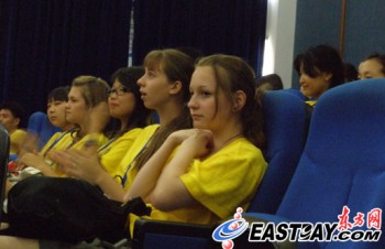 作為見面禮,夏令營的工作人員特意趕制了一段視頻,視頻記錄了他們來到中國后點點滴滴的生活。有在北京一起去頤和園、爬長城的留念,也有昨天參觀上海博物館、游城隍廟的新鮮記憶。放到他們在古街坐三輪車、身穿中國古代傳統大紅嫁衣時,引來了現場同學的一陣大笑,會場的氣氛瞬間熱烈了起來。
