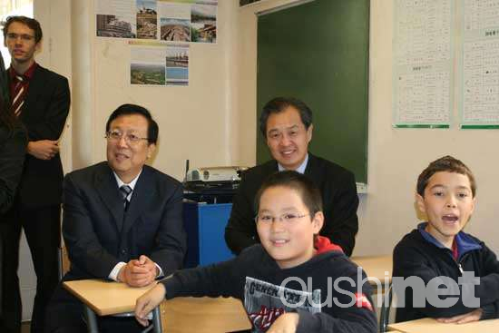 10月13日,該校校長安妮·弗雷斯蒂埃女士(Any FORESTIER)和巴黎學區長巴特里克·熱拉爾先生(Patrick GERARD)熱情歡迎中國教育部副部長郝平、中國駐法大使孔泉及其夫人等,赴德薩伊中學進行中文班教學觀摩,并在隨后接受了中方贈送的圖書和教具。