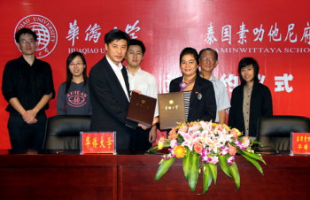 中新網(wǎng)10月27日電 據(jù)華僑大學(xué)新聞網(wǎng)消息,10月24 日上午,華僑大學(xué)與泰國(guó)素叻他尼府華萌學(xué)校在華大廈門(mén)校區(qū)簽署合作備忘錄。華僑大學(xué)華文教育辦公室主任趙明光、泰國(guó)素叻他尼府華萌學(xué)校副經(jīng)理安蒙麗分別代表雙方在合作備忘錄上簽字。出席簽字儀式的還有泰國(guó)素叻他尼府華萌學(xué)校校董涂碧泉及華僑大學(xué)華文教育辦公室工作人員。