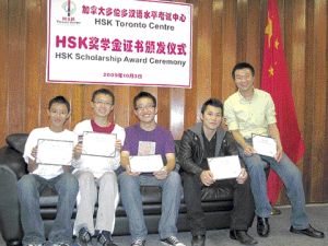 郭凌清、李賦涵、張庭、黃帝鈞、張龍江五位同學,都在去年參加由加拿大多倫多漢語水平考試中心主辦的中國國家漢語水平考試,并取得優異成績。4日他們在親友和家長的陪同下,領取國家漢辦孔子學院獎學金證書,并暢談暑期前往中國學習漢語的美妙經歷。