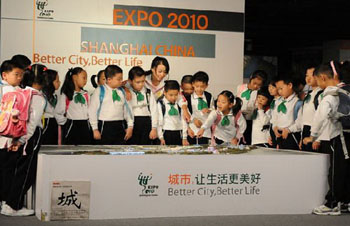 中新網5月17日電 據上海市僑辦消息,日前,上海市盧灣區華文教育基地——七色花小學的操場熱鬧非凡,來自美國、英國、澳大利亞、巴西等不同國家和地區的同學和家長在十個國家場館平面模型前擺開了陣勢,模擬世博參觀情景。