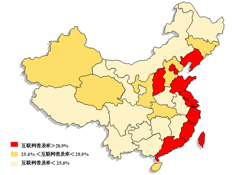 中國互聯(lián)網(wǎng)絡(luò)信息中心按照互聯(lián)網(wǎng)普及程度差異將我國的互聯(lián)網(wǎng)發(fā)展分為三個梯隊(duì)。第一梯隊(duì):互聯(lián)網(wǎng)發(fā)展水平較好,普及率高于全國平均水平。主要集中在東部沿海地區(qū),包括北京、上海、廣東、天津、浙江、福建、遼寧、江蘇、山西、山東十個省或直轄市。其中,遼寧和山東網(wǎng)民規(guī)模仍保持較快增長速度,年增幅分別達(dá)到40.2%和39.6%,增長排名第10、12位。