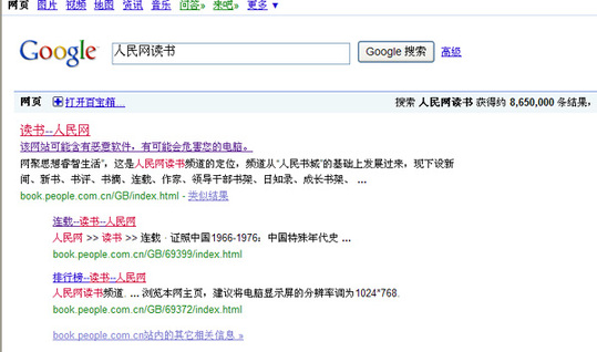 這兩天,你如果通過谷歌檢索“人民網讀書頻道”,檢索結果里會發現這樣的提示:“該網站可能含有惡意軟件,有可能會危害您的電腦!