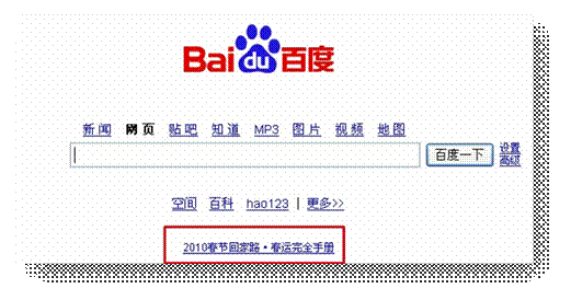 2月3日零點,百度、去哪兒網聯合制作的“2010春節回家路•春運完全手冊”專題上線發布,同時專題入口被放置在最引人注目的百度網站首頁。這是繼2009年“英特爾·影響明天的是誰?”專題后,百度2010年第一次啟用首頁資源的重大動作。