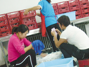 進車間前,張主任囑咐記者,公司每天生產約7000套消毒餐具,難免有的有臟東西,裝箱時要注意檢查。記者問是不是包裝袋內有臟東西就要重新清洗、消毒?張說:“如果是小灰塵,一撣就掉了,也不是不行。”