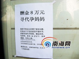 今天下午4點許,南國都市報記者來到海口市海府路汽車東站對面的公交車站看到,在站牌上貼有2張代孕廣告,廣告大致內容如下:“酬金8萬元找代孕媽媽”,因自己子宮問題不能生育,真誠尋找“代孕媽媽”,酬金優厚,包食宿,要求對方年齡30歲以下,身體健康,作風正派。聯系人為王女士,手機號碼13307685###。