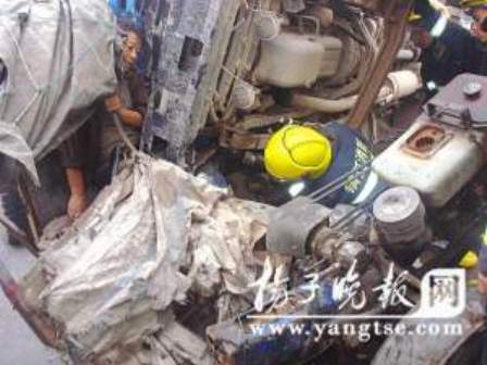 事故發(fā)生后,潤州大隊(duì)七里甸消防中隊(duì)10名官兵奉命趕往現(xiàn)場救援,潤州交巡警迅速趕到現(xiàn)場指揮疏散交通,很快120急救車也趕至現(xiàn)場。10分鐘后,救援官兵到達(dá)現(xiàn)場,發(fā)現(xiàn)拖拉機(jī)簡易駕駛室已嚴(yán)重變形,被困司機(jī)滿臉血污動彈不得,不住發(fā)出痛苦的呻吟聲。救援指揮員查看了現(xiàn)場情況,發(fā)現(xiàn)救援關(guān)鍵在貨車車頭,只有將壓在拖拉機(jī)上的車頭拉開,才能破拆救援,但要將車頭拉離,必須要動用大型吊車,而且需要一定時間。面對不斷呻吟的被困司機(jī),指揮員當(dāng)即請120急救醫(yī)生為其輸液,以減少司機(jī)的痛楚。