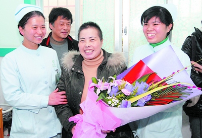 3月2日上午,已將一頭長卷發(fā)剪成寸頭的吳澤連由丈夫陪著坐在病床前的凳子上。此時的她滿面笑容,臉上還帶著一絲紅潤。入院66天來,在眾多親友都認為“沒得救了”的情況下,她硬是從“鬼門關(guān)”被拉了回來。