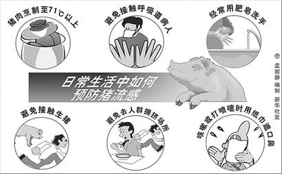 避免接觸流感樣癥狀(發(fā)熱,咳嗽,流涕等)或肺炎等呼吸道病人;注意個(gè)人衛(wèi)生,經(jīng)常使用肥皂和清水洗手,尤其在咳嗽或打噴嚏后;避免接觸生豬或前往有豬的場(chǎng)所;避免前往人群擁擠場(chǎng)所;咳嗽或打噴嚏時(shí)用紙巾遮住口鼻,然后將紙巾丟進(jìn)垃圾桶;如在境外出現(xiàn)流感樣癥狀(發(fā)熱,咳嗽,流涕等),應(yīng)立即就醫(yī)(就醫(yī)時(shí)應(yīng)戴口罩),并向當(dāng)?shù)毓残l(wèi)生機(jī)構(gòu)和檢驗(yàn)檢疫部門說明。