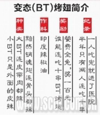 “BT辣就是變態辣!钡曛骱壬脕硪环莶藛握f,“BT烤翅”旁特意寫著膽小者勿嘗,辣死人他們不負責。據介紹,“BT烤翅”分為大BT和小BT兩種,小BT只是外面的皮辣,大BT連皮帶肉都辣,至于超級極品——“黯然銷魂翅”則連里面的骨頭也是辣的。