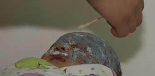 記者昨天(1月3日)在醫院見到了孩子,醫生把藥膏從孩子頭頂敷到孩子嘴唇上方,白白的一大片。孩子出現高燒,“醫生說要過了7天感染期,才能知道孩子傷到啥程度,能不能留下疤痕。”楊丹說。