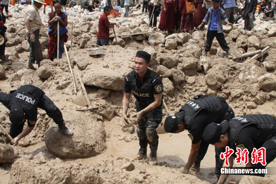 中新網舟曲8月9日電(劉賢 徐楊祎)成都公安特警兩批共150名救援官兵于9日先后到達甘肅舟曲災區。救援官兵組織的35人青年突擊隊已協助武警和當地民兵救出1名遇困群眾,挖出兩具遇難群眾遺體。