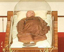 昨天政、商、宗教各界代表及信眾們前往瞻仰法師最后一面。方丈和尚向來賓講解懸掛堂中,書法家杜忠誥老師所寫的師父最后叮囑“寂滅為樂”以及四句偈“無事忙中老,空里有哭笑,本來沒有我,生死皆可拋。”說明圣嚴法師一向“歡喜看生死”的態度。
