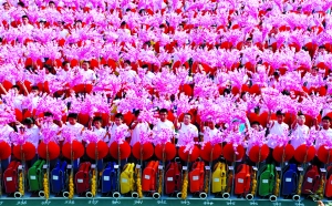 這些學生是慶典“七色光”背景方陣的一部分。該方陣共有上萬小學生,位于廣場最前邊,正對觀禮臺,在軍樂隊、鼓陣兩側呈括號狀分散開。學生們“七色光”色彩由頭上戴的花環呈現。